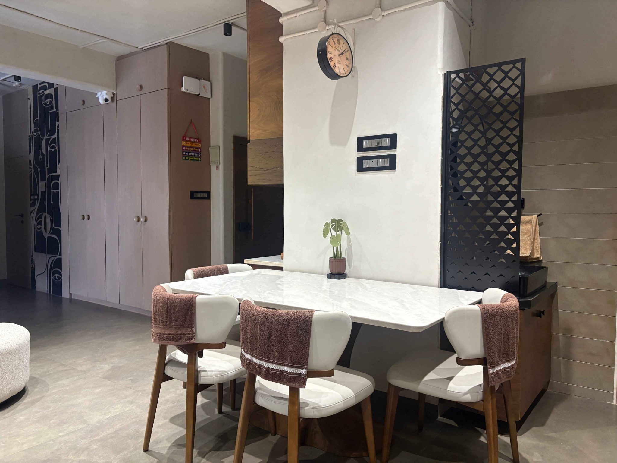 This Office Space Is Part Of Our Signature Lime Texture Projects In Nashik, Designed With A Modern Minimal Aesthetic, Clean Lime Wall Finishes, And A Calm, Productive Atmosphere. The Smooth Textures, Balanced Lighting, And Elegant Design Elements Create A Professional And Inspiring Work Environment.